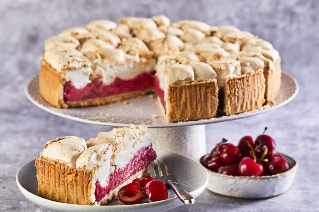 This cherry spectacle showcases crisp sweet pastry that is filled with a sour cherry fruit filling before being topped with a crisp yet fluffy meringue.