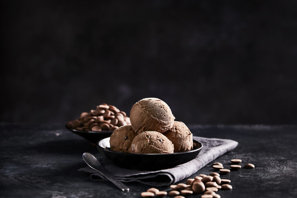 Chocolate diary ice cream with chocolate chips and a chocolate flavoured ripple.