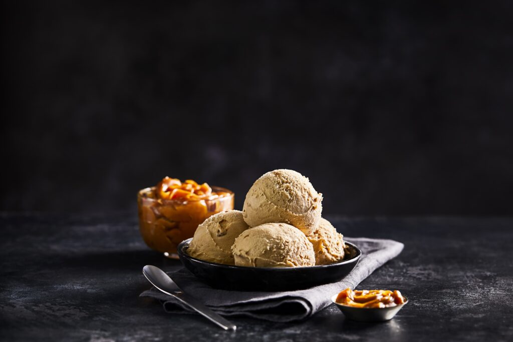 A salted caramel flavoured dairy ice cream, rippled with caramel sauce and studded with butterscotch pieces.